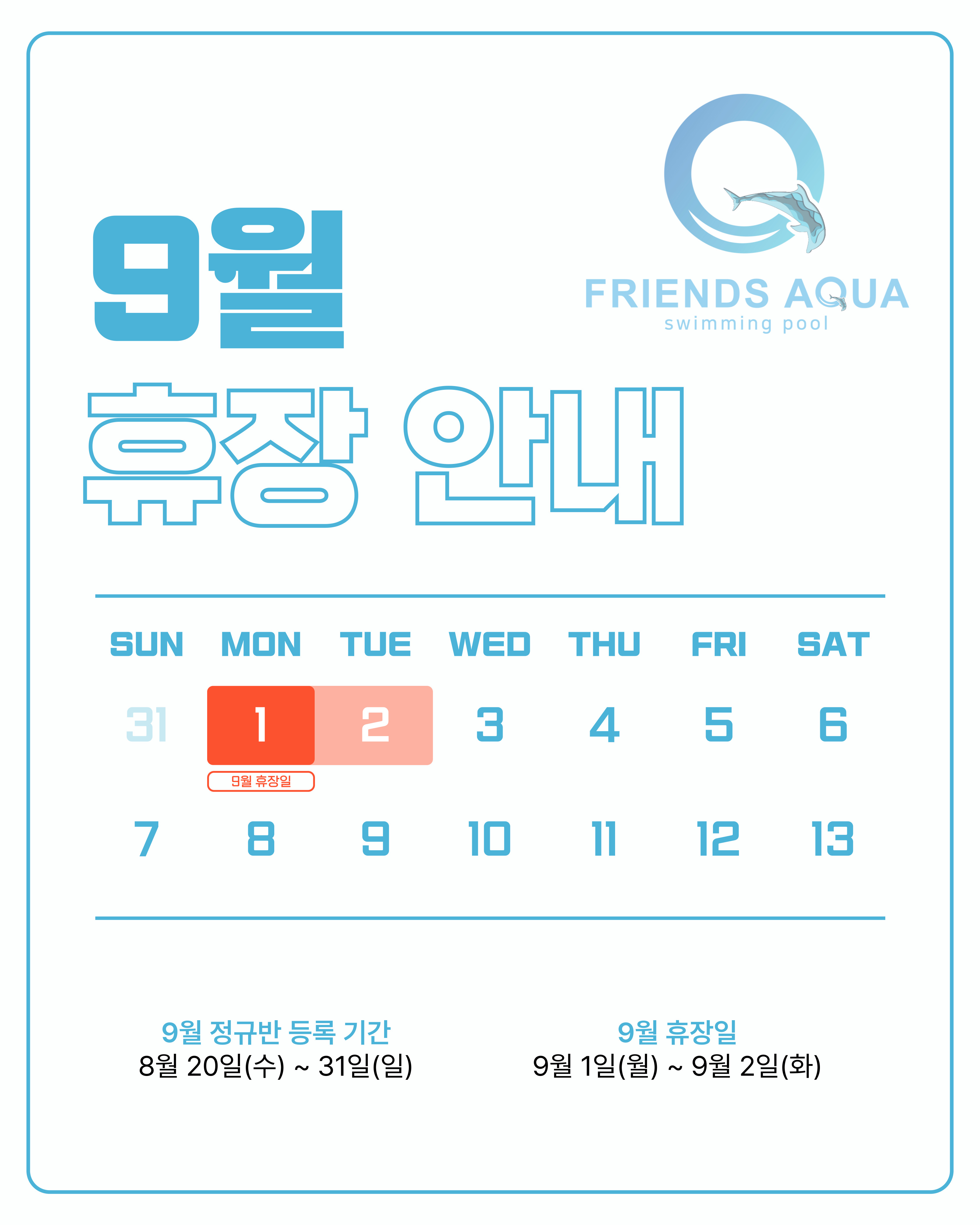 9월 정규반 등록 일정과 휴장일을 아래와 같이 안내드립니다.